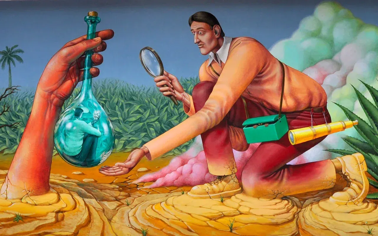 ButtonMuralista enfocado en la naturaleza del paisaje con toques de existencialismo y surrealismo.